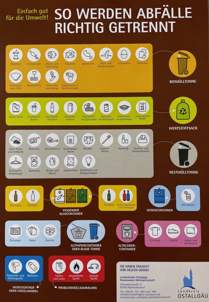 In Füssen, waste is separated into organic waste, residual waste, packaging with a green dot in the yellow or green bag and waste glass. See also the “poster” of the waste disposal company Ostallgäu below.